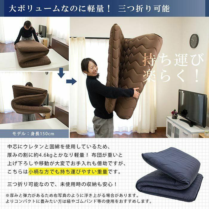 体圧分散効果のある凹凸ウレタンと固わたを中芯に使用したたっぷりボリュームの敷き布団。ボリュームがあるのに軽いので取り扱いも簡単。寝心地と扱いやすさを兼ね揃えたお手頃価格の敷き布団です。