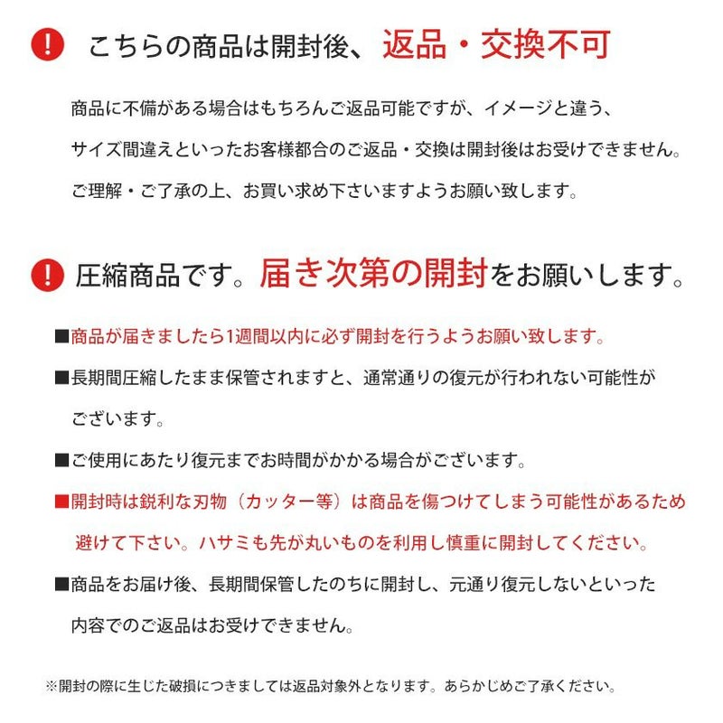 ※圧縮状態でお届けします。長期間圧縮したままで保管されますと、通常通り復元されない場合がありますので、商品到着後1週間以内に必ず開封してください。