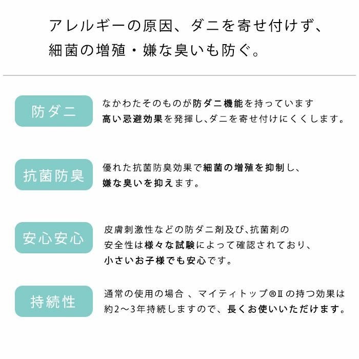 中わたにはテイジンの防ダニ抗菌防臭わた「マイティトップII ECO」を使用。