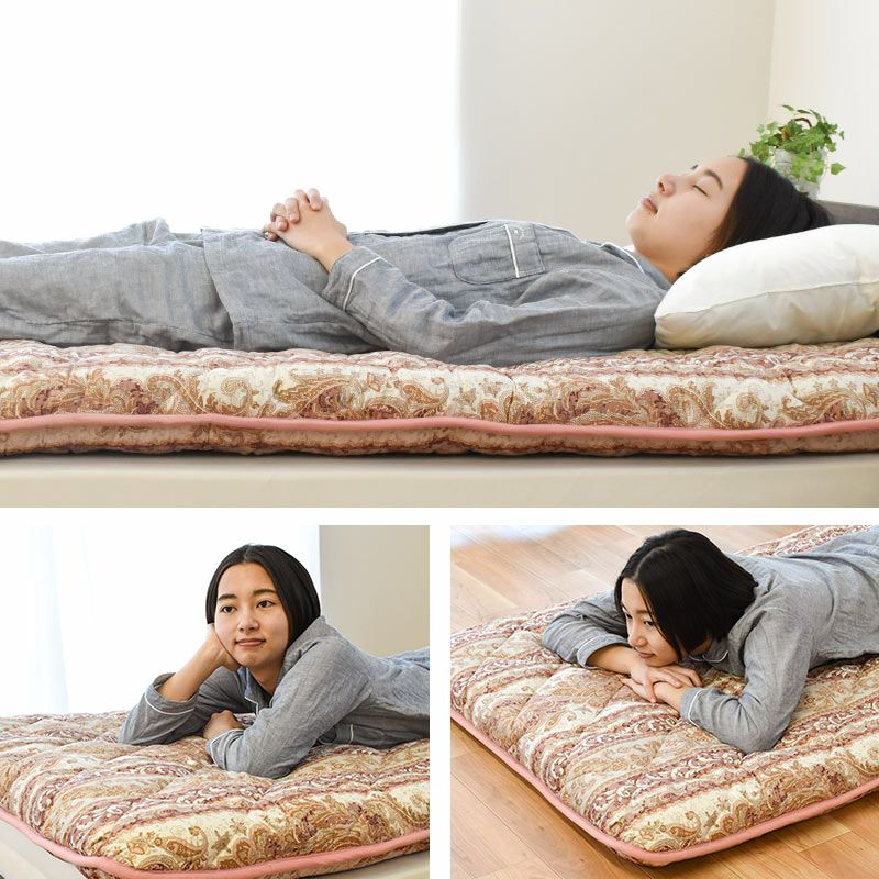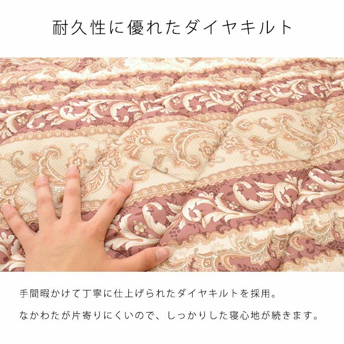 丁寧に仕上げられたダイヤキルトにて耐久性にも優れ、中わたが片寄りにくいのでしっかりした寝心地が続きます。