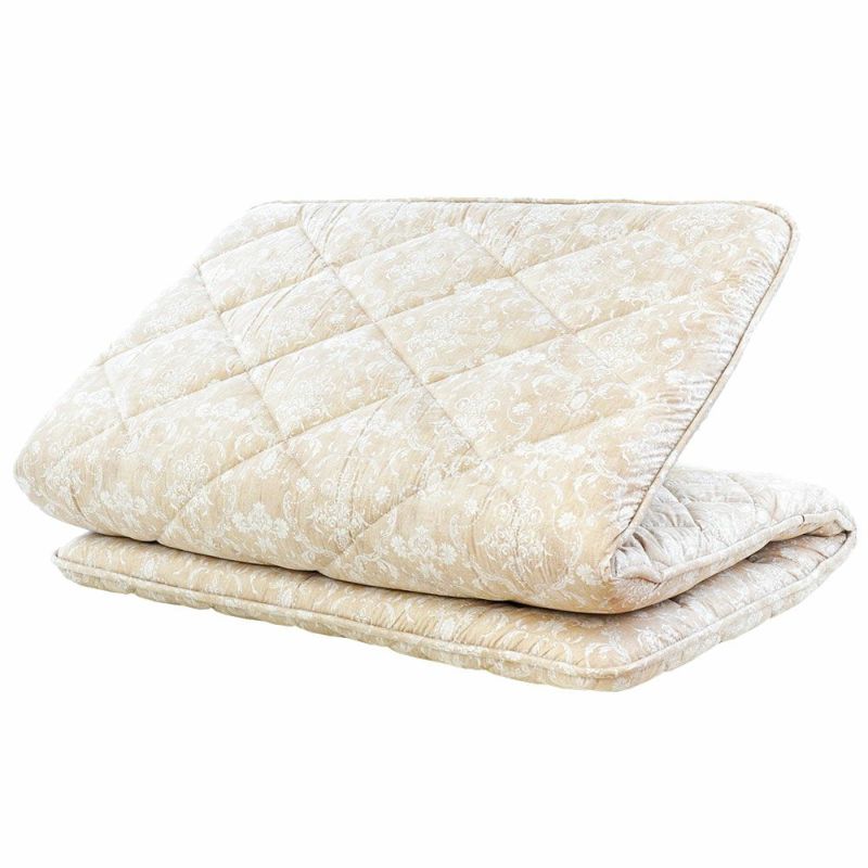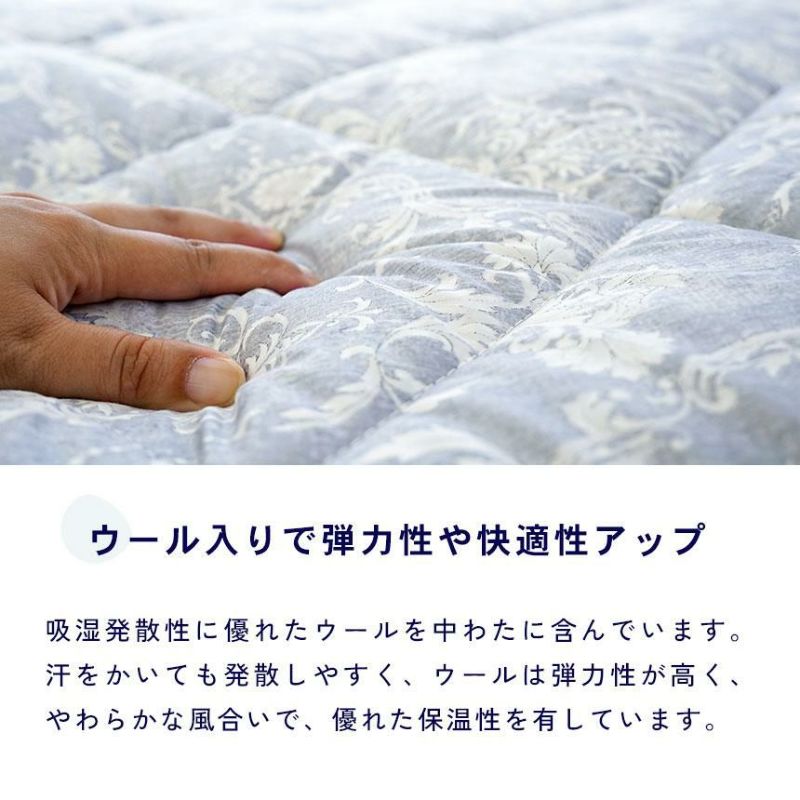 しっかりめのフラット固わたが入っているので、底付き感はあまり感じません。ポリエステル固綿を羊毛50%混の中綿で包んだ三層構造で体を支えます。吸湿発散性に優れたウールを中わたに含んでいます。汗をかいても発散しやすく、ウールは弾力性が高くやわらかな風合いで、優れた保温性を有しています。