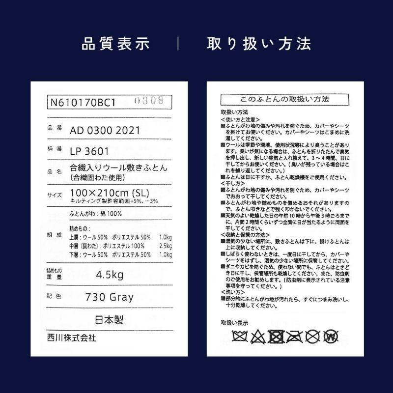 5. 【完売】西川 羊毛混三層式固綿入り 敷き布団 スリーピュア シングルロング 100×210cm
