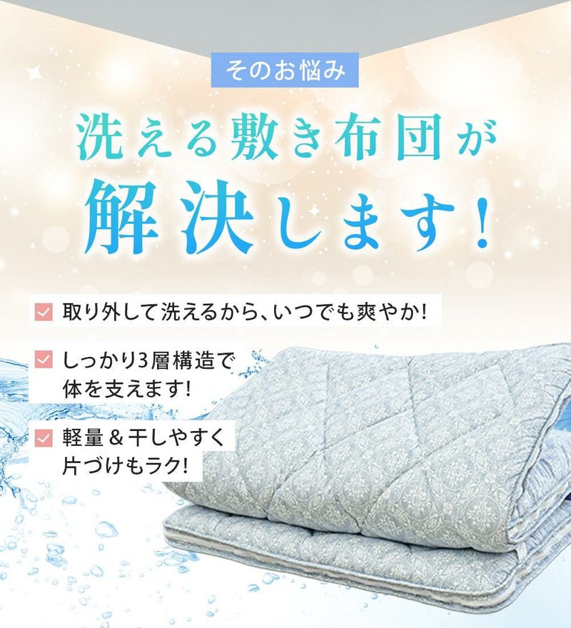 洗うを身近に。家庭洗濯機OK!汗・皮脂の汚れやニオイが毎日蓄積される敷布団を洗ってリセット 洗うことによって、ダニやカビを除去・繁殖を抑え、アレルギー対策にも効果的!洗える敷布団です。
